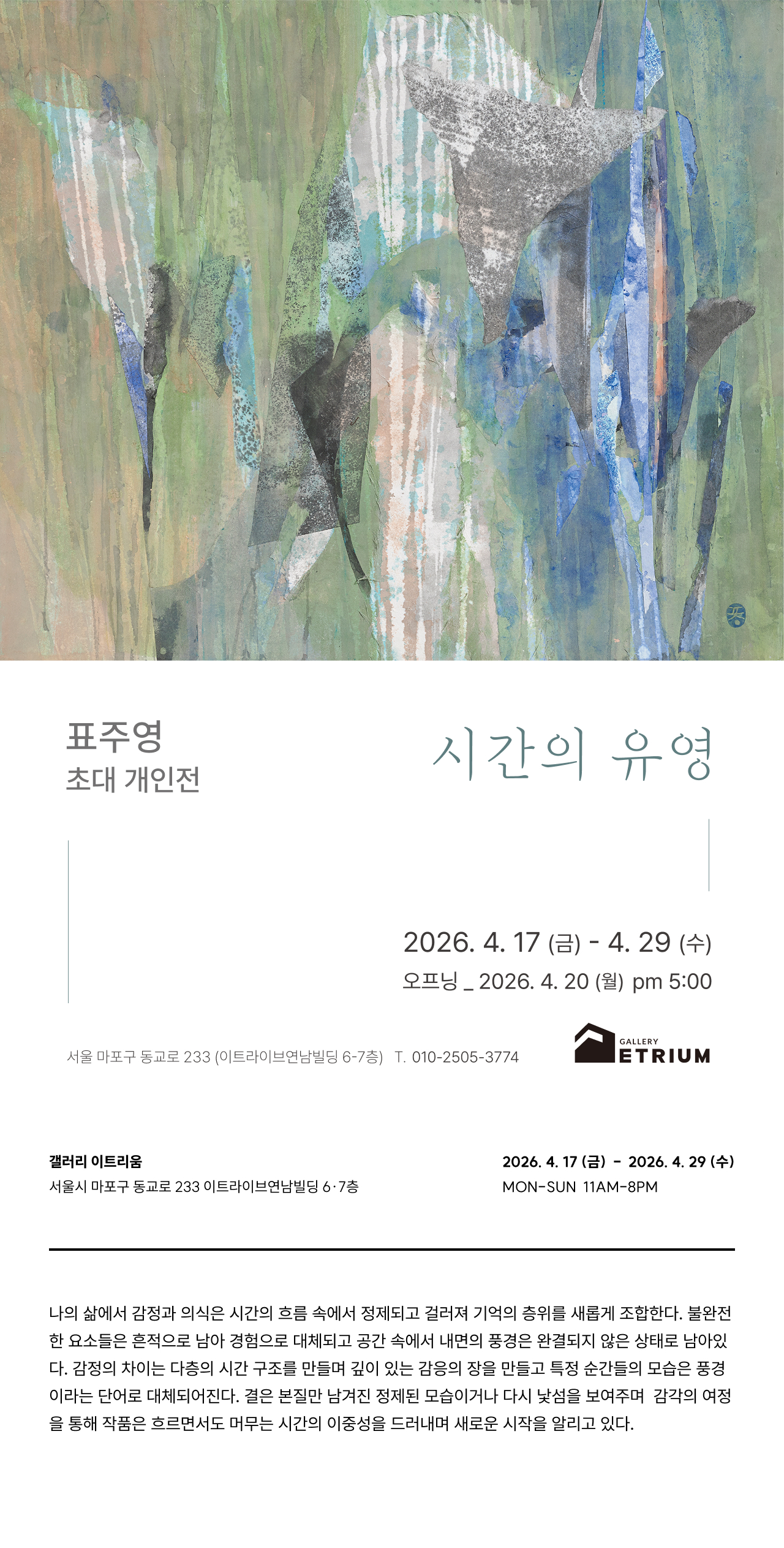 - 나의 삶에서 감정과 의식은 시간의 흐름 속에서 정제되고 걸러져 기억의 층위를 새롭게 조합한다. 불완전한 요소들은 흔적으로 남아 경험으로 대체되고 공간 속에서 내면의 풍경은 완결되지 않은 상태로 남아있다. 감정의 차이는 다층의 시간 구조를 만들며 깊이 있는 감응의 장을 만들고 특정 순간들의 모습은 풍경이라는 단어로 대체되어진다. 결은 본질만 남겨진 정제된 모습이거나 다시 낯섬을 보여주며 감각의 여정을 통해 작품은 흐르면서도 머무는 시간의 이중성을 드러내며 새로운 시작을 알리고 있다.