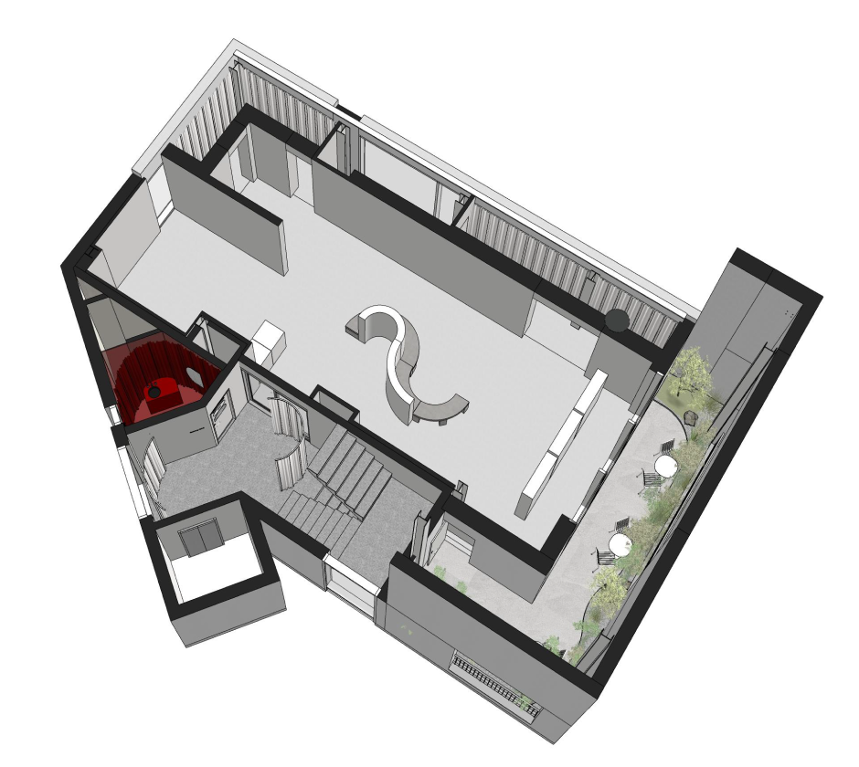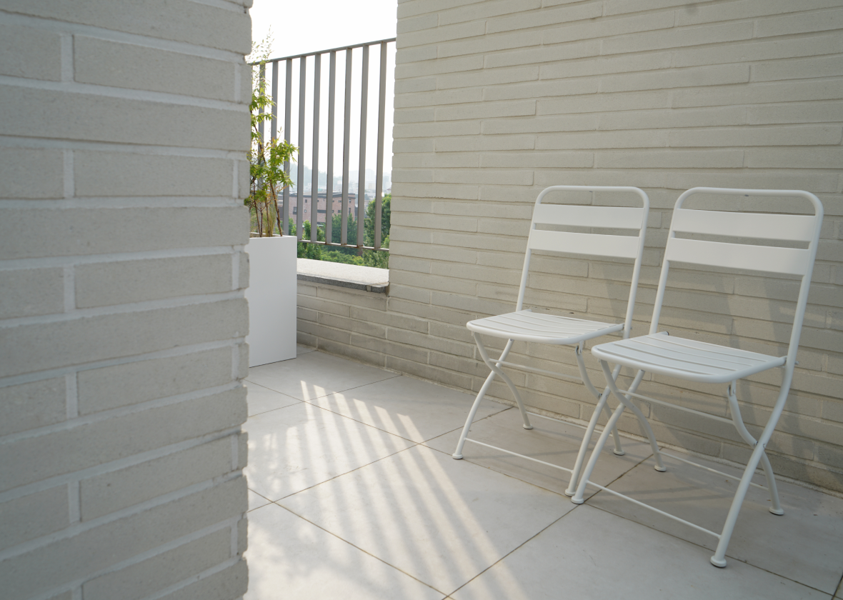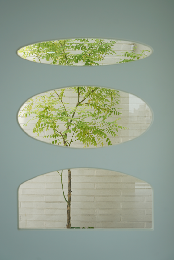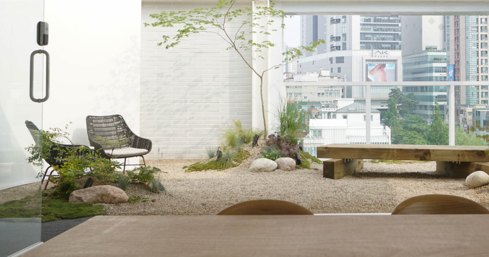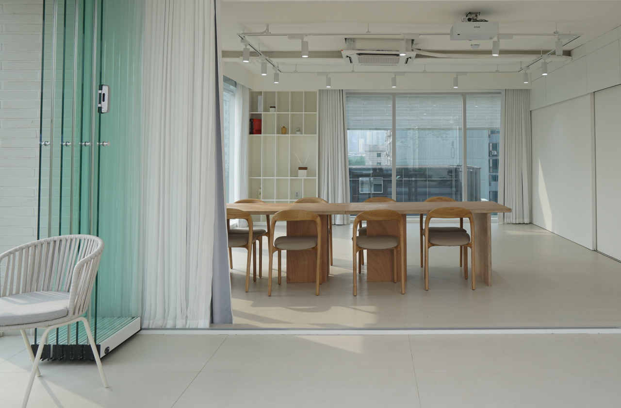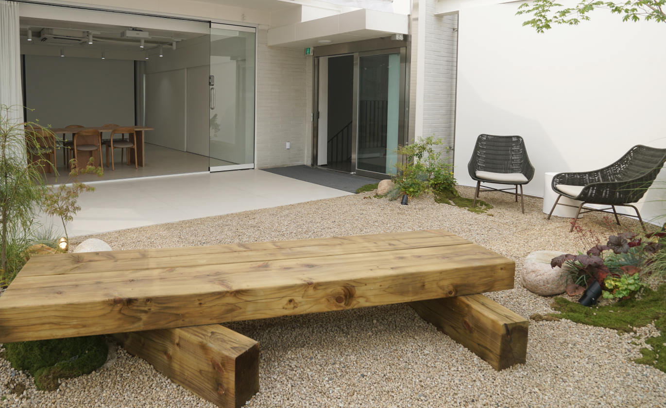 전면 유리창 너머로 펼쳐지는 경의선숲길:연트럴파크의 풍경은 자연광과 어우러져 공간에 생기를 더하며, 연결된 야외 테라스는 관람자에게 단순한 휴식을 넘어 감상 이후의 여운까지 경험할 수 있는 감각적 여백으로 기능합니다.