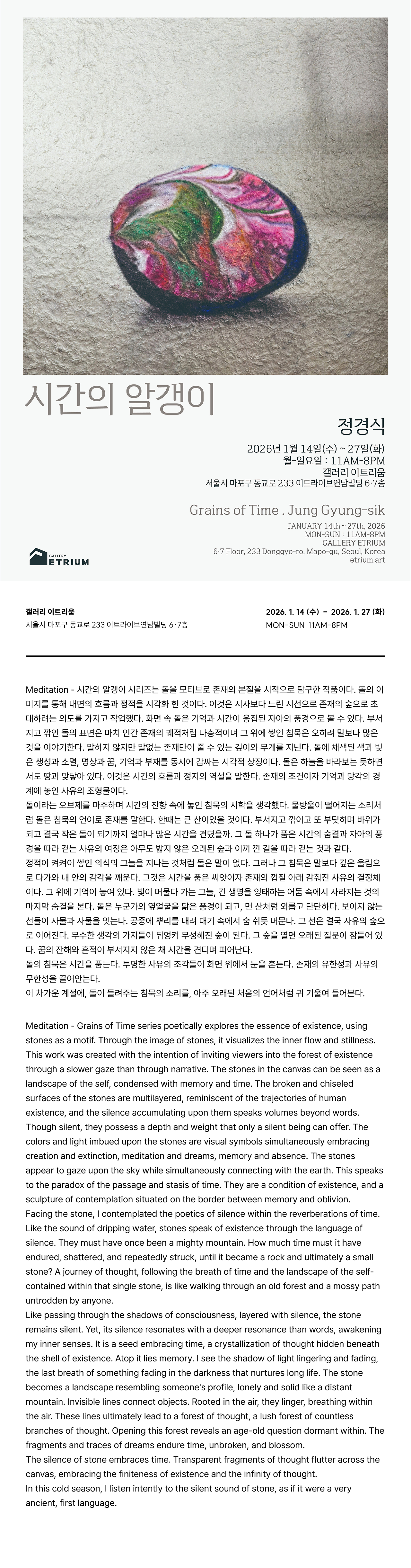 - 시간의 알갱이 시리즈는 돌을 모티브로 존재의 본질을 시적으로 탐구한 작품이다. 돌의 이미지를 통해 내면의 흐름과 정적을 시각화 한 것이다. 이것은 서사보다 느린 시선으로 존재의 숲으로 초대하려는 의도를 가지고 작업했다. 화면 속 돌은 기억과 시간이 응집된 자아의 풍경으로 볼 수 있다. 부서지고 깎인 돌의 표면은 마치 인간 존재의 궤적처럼 다층적이며 그 위에 쌓인 침묵은 오히려 말보다 많은 것을 이야기한다. 말하지 않지만 말 없는 존재만이 줄 수 있는 깊이와 무게를 지닌다. 돌에 채색된 색과 빛은 생성과 소멸, 명상과 꿈, 기억과 부재를 동시에 감싸는 시각적 상징이다. 돌은 하늘을 바라보는 듯 하면서도 땅과 맞닿아 있다. 이것은 시간의 흐름과 정지의 역설을 말한다. 존재의 조건이자 기억과 망각의 경계에 놓인 사유의 조형물이다.